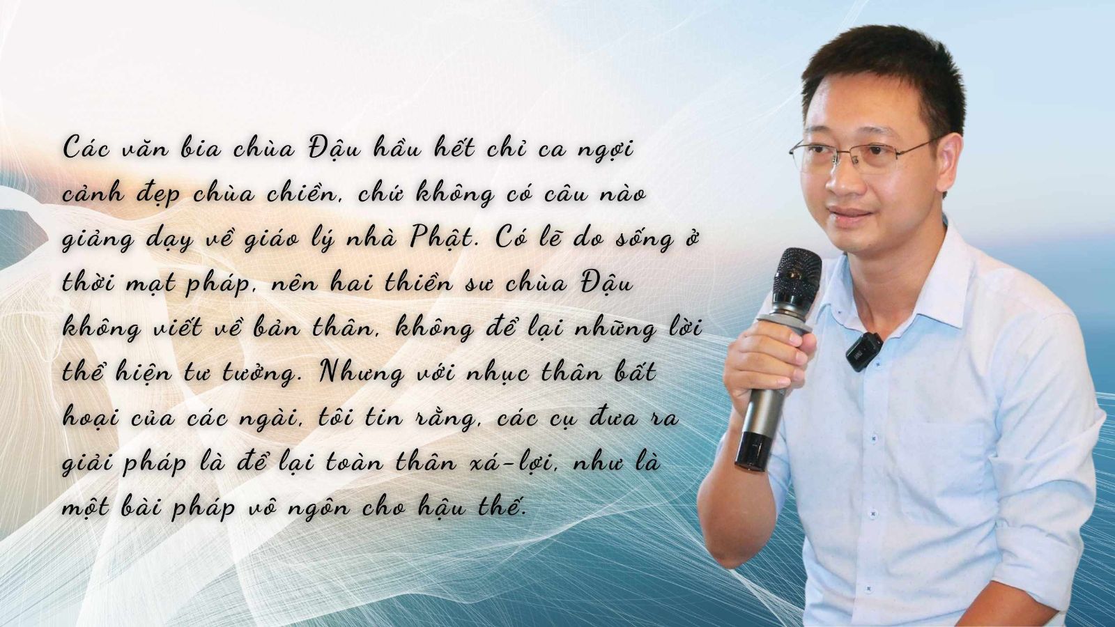 Điều đáng chú ý, các văn bia chùa Đậu hầu hết chỉ ca ngợi cảnh đẹp chùa chiền, chứ không có câu nào giảng dạy về giáo lý nhà Phật. Có lẽ do sống ở thời mạt pháp, nên hai thiền sư chùa Đậu không viết về bản thân, không để lại những lời thể hiện tư tưởng. Nhưng với nhục thân bất hoại của các ngài, tôi tin rằng, các cụ đưa ra giải pháp là để lại toàn thân xá-lợi, như là một bài pháp vô ngôn cho hậu thế.