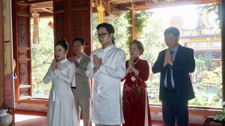 Trong không gian thiêng liêng tại buổi lễ, đôi bạn trẻ cung đối trước chư Tôn đức chứng minh dâng lời thề nguyện kết hôn và phát nguyện cùng nhau xây dựng hạnh phúc gia đình.