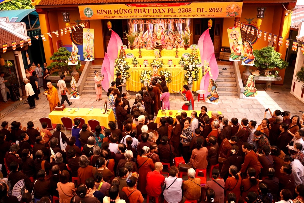 Chư Tôn đức cùng Phật tử niệm Phật cầu gia bị, toàn thể đại chúng trang nghiêm trước lễ đài Phật đản tại chính điện chùa Duệ Tú cử hành nghi lễ Phật Đản sinh.