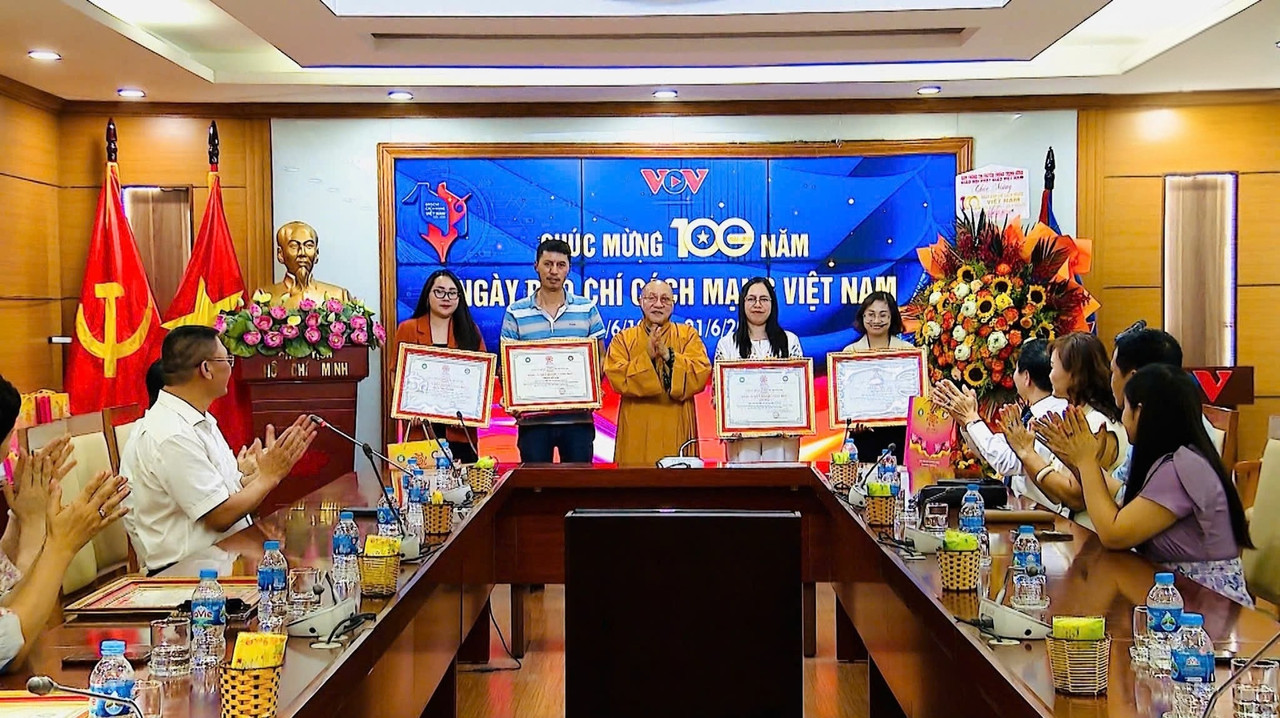 Nhân dịp này, đoàn tặng lẵng hoa chúc mừng và Bằng tuyên dương công đức cho tập thể Đài Tiếng nói Việt Nam, Thông tấn xã Việt Nam và báo Tin Tức, cảm ơn những đóng góp quý báu các đơn vị trong truyền tải hình ảnh chân thực, tích cực đến với đông đảo quần chúng nhân dân trong và ngoài nước dịp Đại lễ Vesak Liên Hợp Quốc vừa qua.