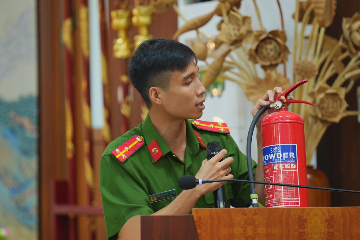Tiếp đó, Thượng úy Phùng Văn Trung – Phòng PC07 Công an TP. Hà Nội đã hướng dẫn Tăng Ni kỹ năng phòng cháy chữa cháy trong môi trường tự viện, kết hợp giữa lý thuyết và các tình huống mô phỏng sinh động. Chư Tăng Ni được trực tiếp thực hành kỹ năng xử lý khi xảy ra cháy nổ, cách thoát hiểm an toàn và sơ cứu ban đầu – qua đó nâng cao ý thức tự bảo vệ và bảo vệ cộng đồng.