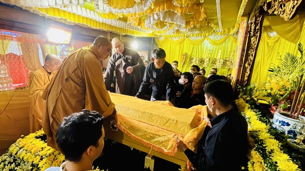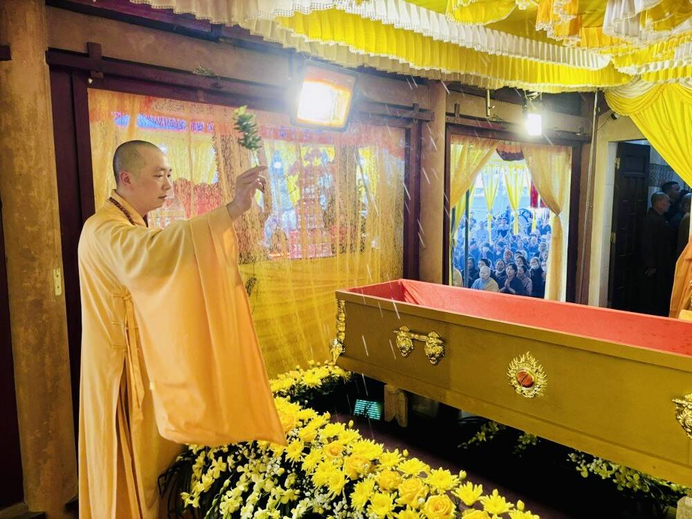 Trước đó, Môn đồ Pháp quyến hiếu quyến đã cung thỉnh Thượng Tọa Thích Thanh Nghĩa quang lâm chính điện cử hành nghi thức thỉnh Phật và khai kinh. Sau khi môn đồ pháp quyến – hiếu quyến dâng lời tác bạch thỉnh Tăng, chư tôn đức đã cử hành thời tụng kinh A Di Đà; trong tiếng niệm Phật trang nghiêm của đại chúng, chư Tôn đức và môn đồ pháp quyến cung thỉnh nhục thân cố Đại đức Thích Thanh Ngọc trang nghiêm nhập kim quan theo đúng nghi lễ truyền thống.