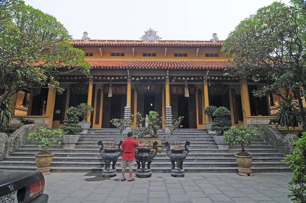 Bước qua cổng Tam quan là phần sân rộng gần 20 mét, sâu 6 mét, lát gạch, đây là nơi diễn ra các khóa lễ ngoài trời, nơi tín đồ phật tử hành lễ. Chùa chính được xây trên nền cao hơn mặt sân khoảng 1,9 mét, từ sân lên nền chùa với 11 bậc ốp bằng đá.