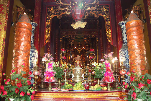 Nhìn vào Chính điện, ngoài cùng là hương án, trên đặt tòa Cửu phẩm đèn mầu lấp lánh. Trong Thượng điện có 4 lớp thờ, tính từ trên xuống: