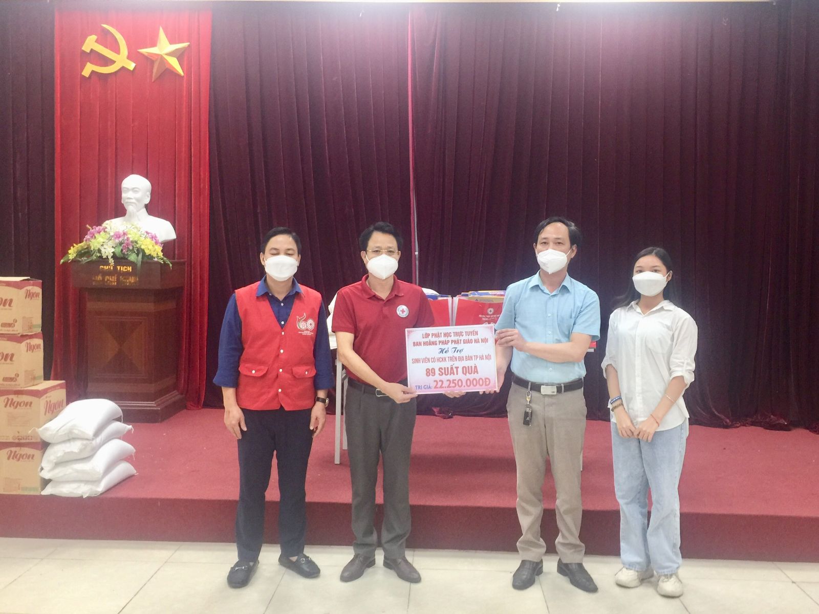 Lớp phó Tạ Đức Thắng - phụ trách công tác xã hôi, đại diện Ban Cán sự Lớp Phật Học Trực Tuyến khóa 1 cùng với đồng chí Đào Ngọc Triệu - Ủy viên Ban Thường vụ Trung ương Hội Chữ thập đỏ Việt Nam, CT. Hội Chữ thập đỏ thành phố Hà Nội; đồng chí Nguyễn Xuân Hiền - Phó Chủ tịch Hội CTĐ Thành Phố Trao quà cho sinh viên khó khăn tại các trường Đại học.
