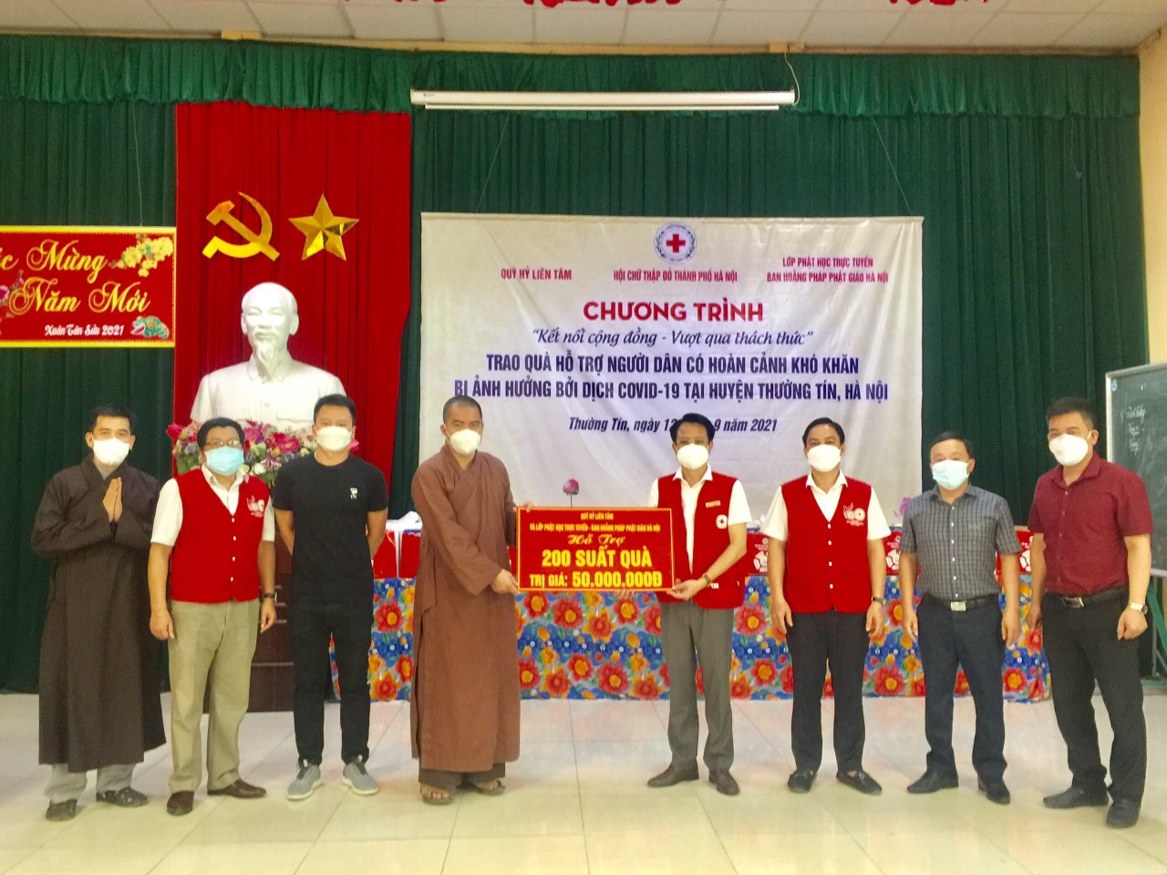 Đồng chí Đào Ngọc Triệu - Ủy viên Ban Thường vụ Trung ương Hội Chữ thập đỏ Việt Nam, CT. Hội Chữ thập đỏ thành phố Hà Nội; đồng chí Nguyễn Xuân Hiền - Phó Chủ tịch Hội CTĐ Thành Phố; Đại đức Thích Chánh Thuần- Phó Ban Thư ký Ban Hoằng Pháp Phật giáo Hà Nội, anh Nguyễn Mạnh Cường - đại diện Quỹ Hỷ Liên Tâm trao quà cho người dân có hoàn cảnh khó khăn ở 7 xã trong Huyện Thường Tín -TP. Hà Nội.