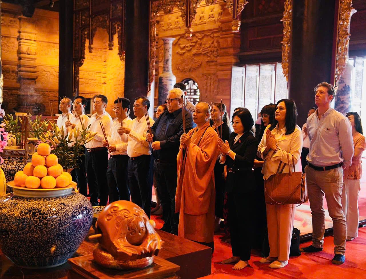 Ông Lê Quốc Chỉnh, Phó Bí thư Tỉnh ủy, Chủ tịch HĐND tỉnh và Ngài Gerry Brownlee, Chủ tịch Quốc hội New Zealand dâng hương tại Điện Tam Thế, chùa Tam Chúc.