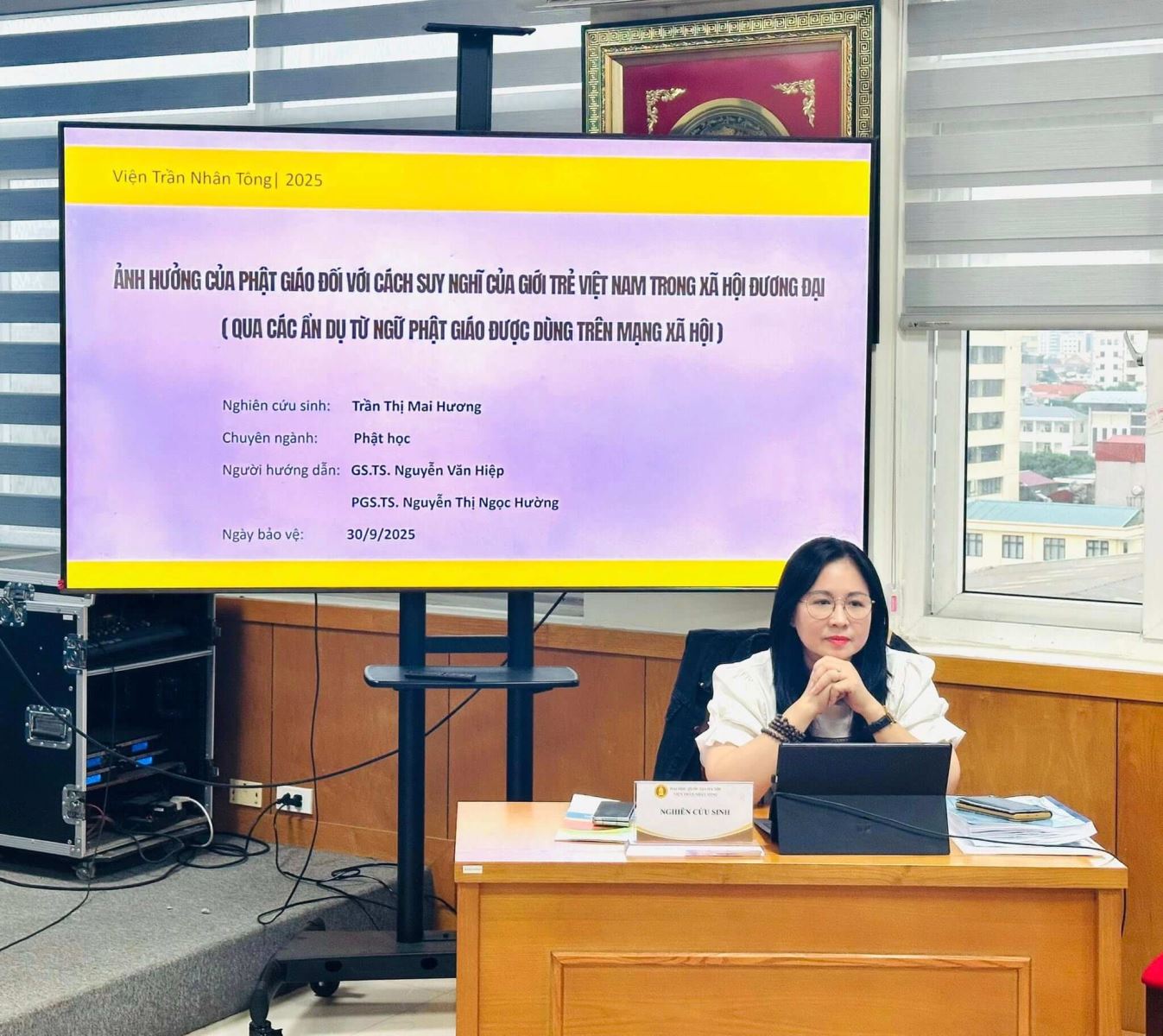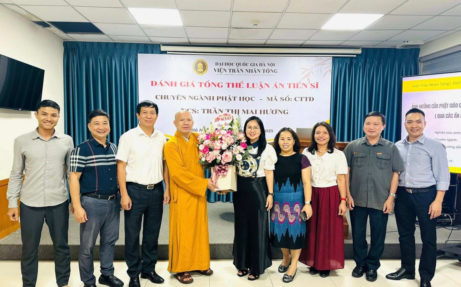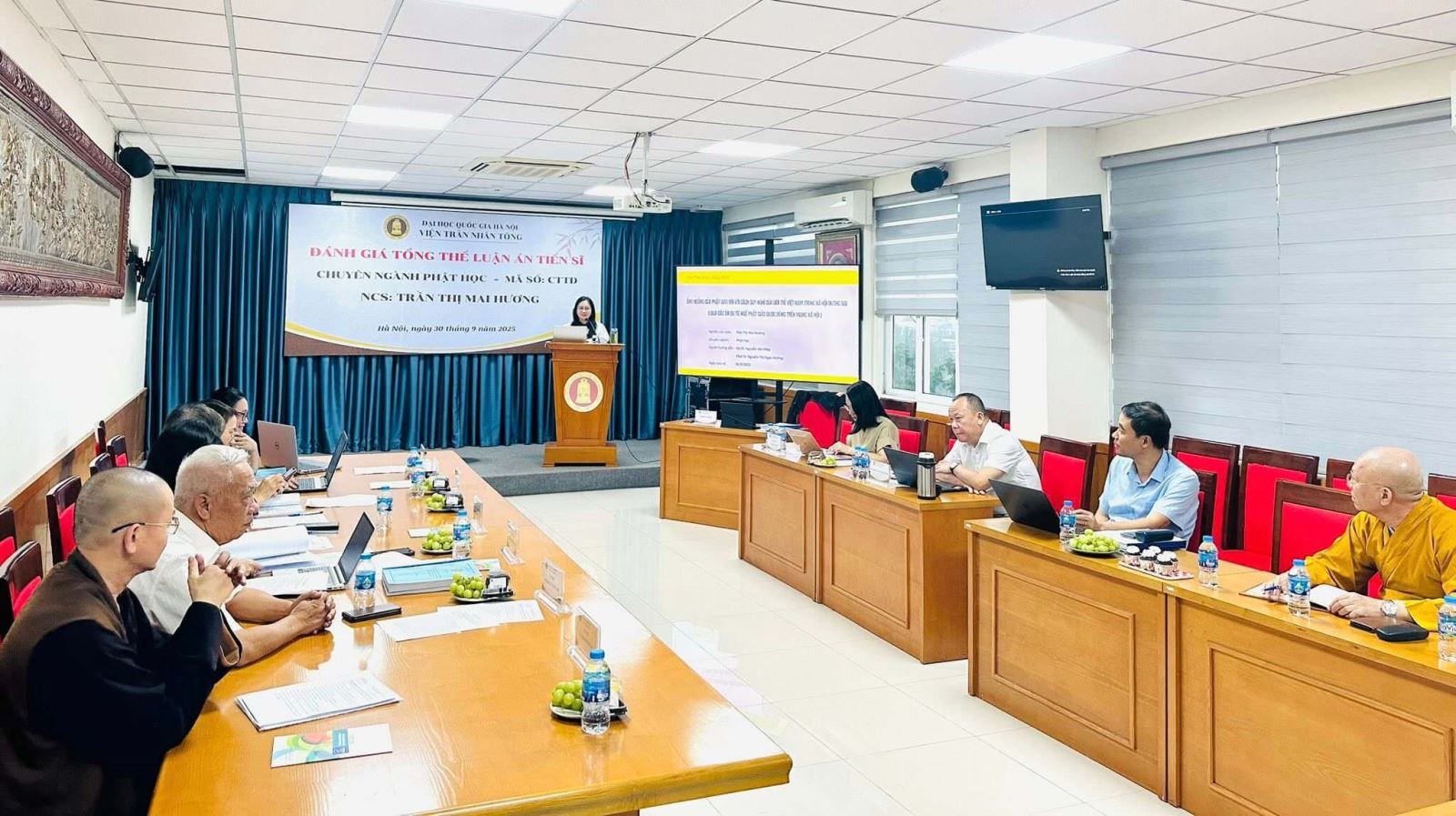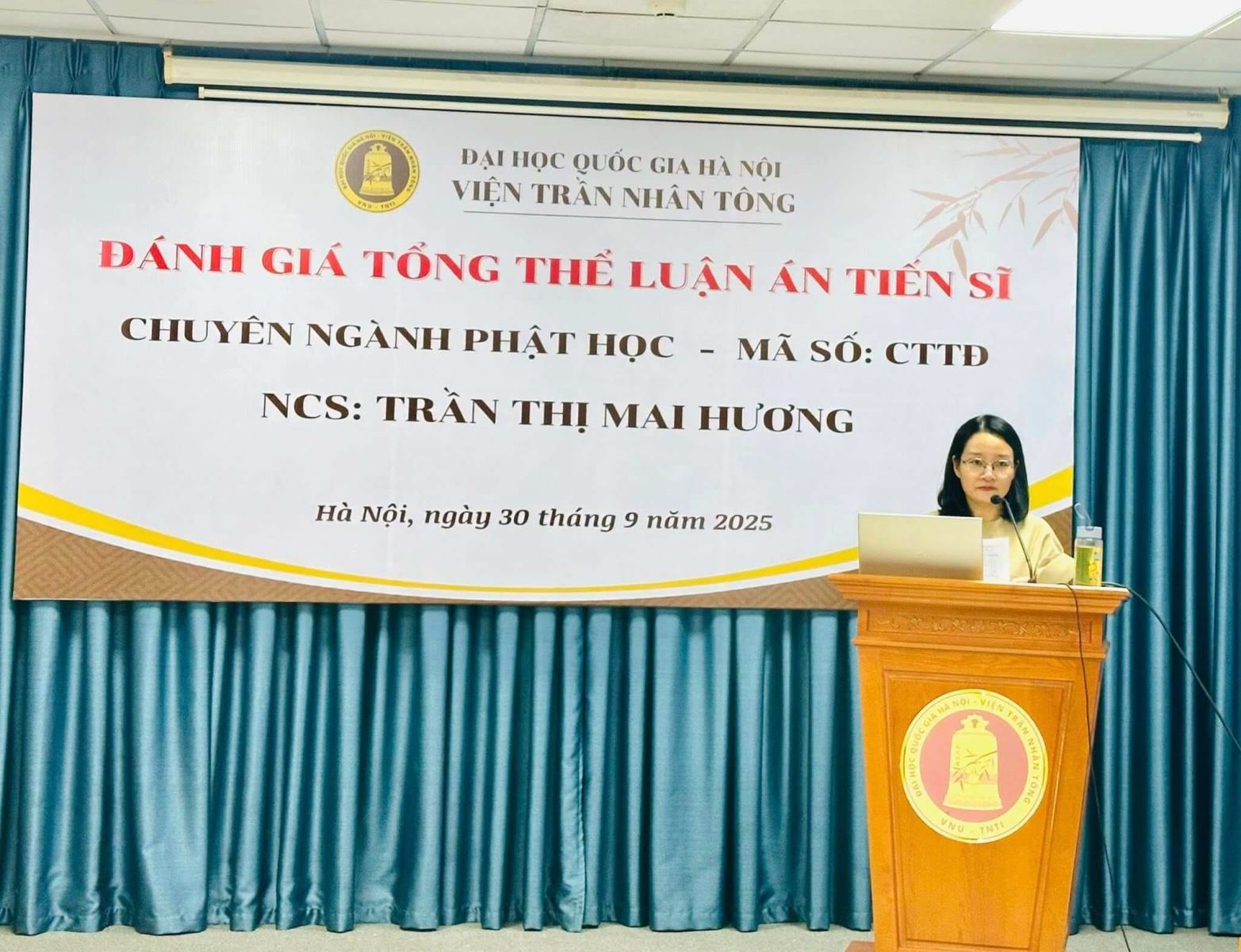 Ngày 30/9/2025, tại trụ sở chính Viện Trần Nhân Tông (ĐHQGHN), đã diễn ra buổi đánh giá tổng thể luận án tiến sĩ của NCS. Trần Thị Mai Hương với đề tài: “Ảnh hưởng của Phật giáo đối với cách suy nghĩ giới trẻ Việt Nam trong xã hội đương đại (qua các ẩn dụ từ ngữ Phật giáo được dùng trên mạng xã hội)”. Luận án được hướng dẫn khoa học bởi GS.TS. Nguyễn Văn Hiệp (Trường Đại học Công nghiệp Hà Nội) và PGS.TS. Nguyễn Thị Ngọc Hường.