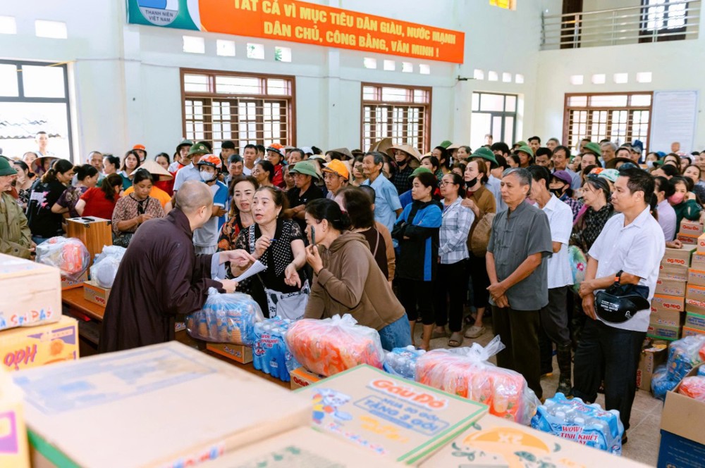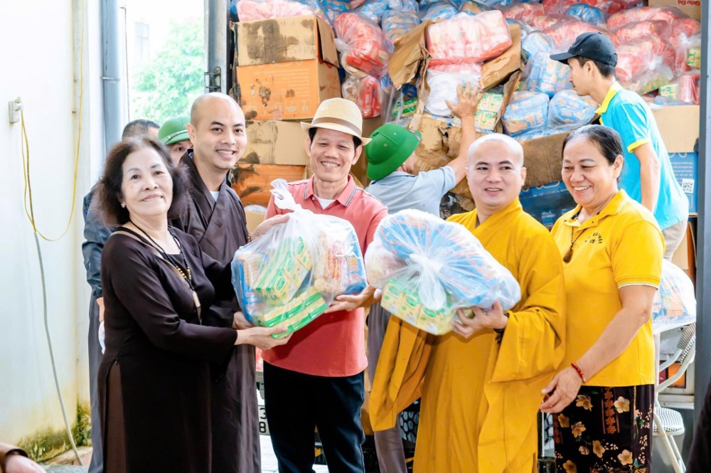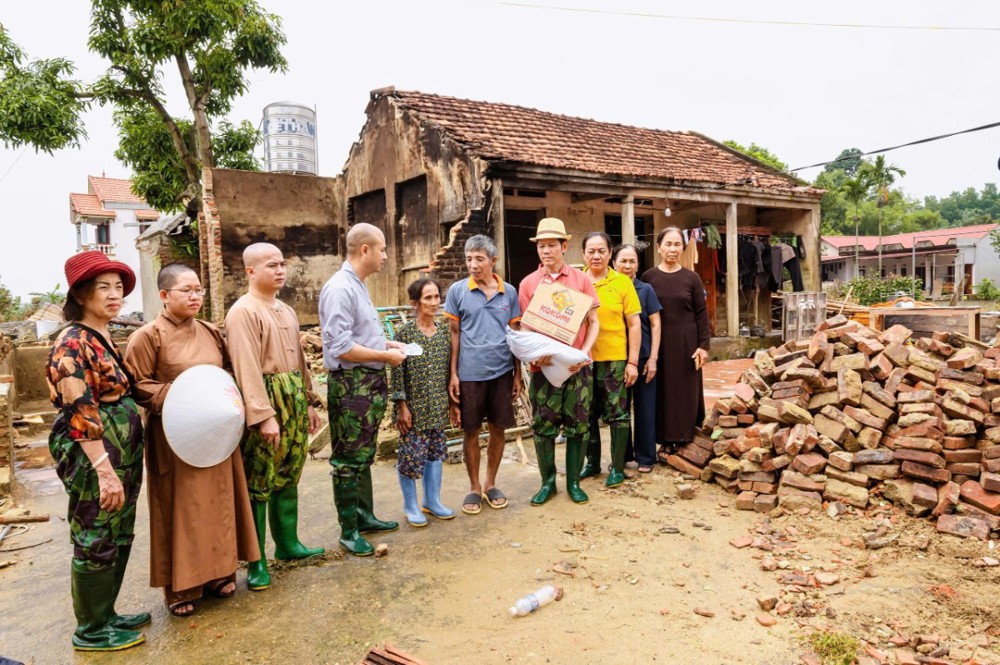 Tại đây, chư Tôn đức Tăng Ni đã ân cần thăm hỏi đời sống, chia sẻ những khó khăn mà người dân đang phải gánh chịu, đồng thời động viên bà con giữ vững tinh thần, sớm khắc phục hậu quả, ổn định cuộc sống.