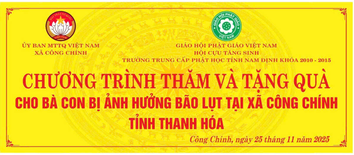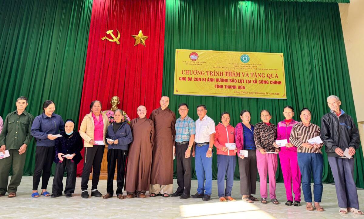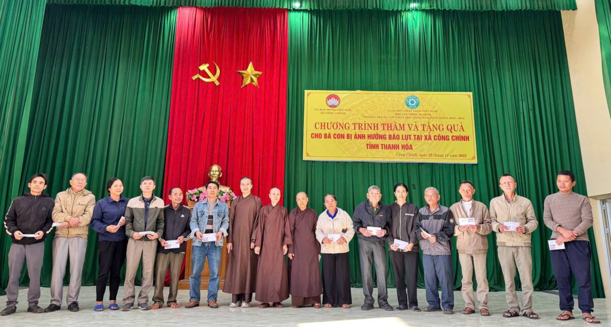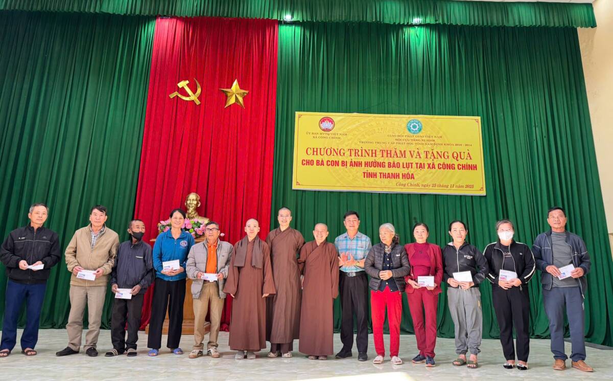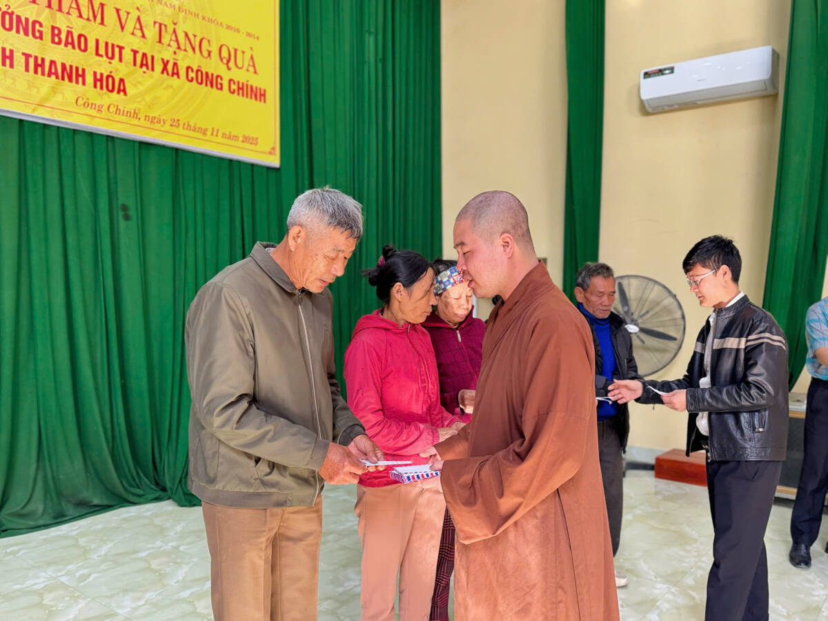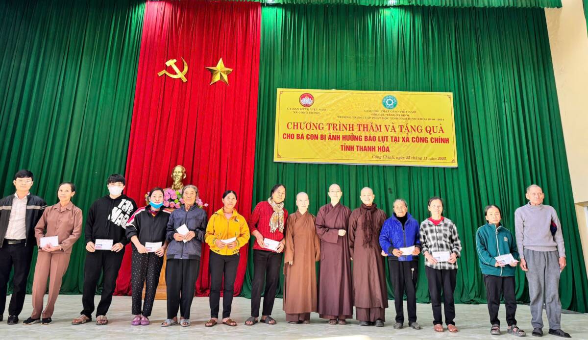 Sáng Ngày 25/11/2025, tại Hội trường ỦUBND xã Công Chính, Hội Cựu Tăng Ni Trung cấp Phật học tỉnh Nam Định khóa V (2010-2014) do Đại Đức Thích Thanh Hưởng làm Trưởng đoàn, đã thực hiện chương trình thăm hỏi và trao quà hỗ trợ bà con bị ảnh hưởng bởi bão lũ.