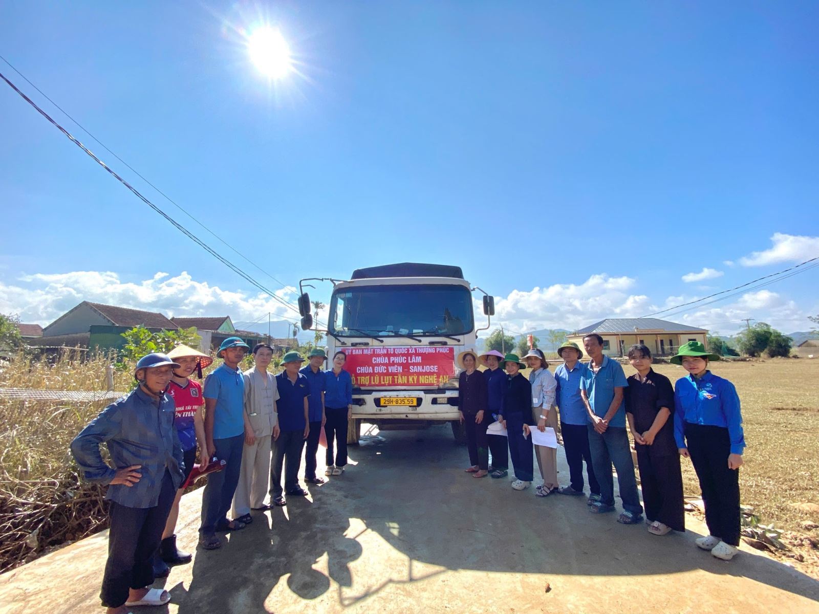 Đón tiếp và đồng hành cùng đoàn có lãnh đạo Đảng ủy, HĐND, UBND và Ủy ban MTTQ xã Tân Kỳ, Nghệ An. Trong không khí ấm áp tình người, những cái nắm tay, những ánh mắt rưng rưng đã làm tan đi giá lạnh của dòng nước lũ.
