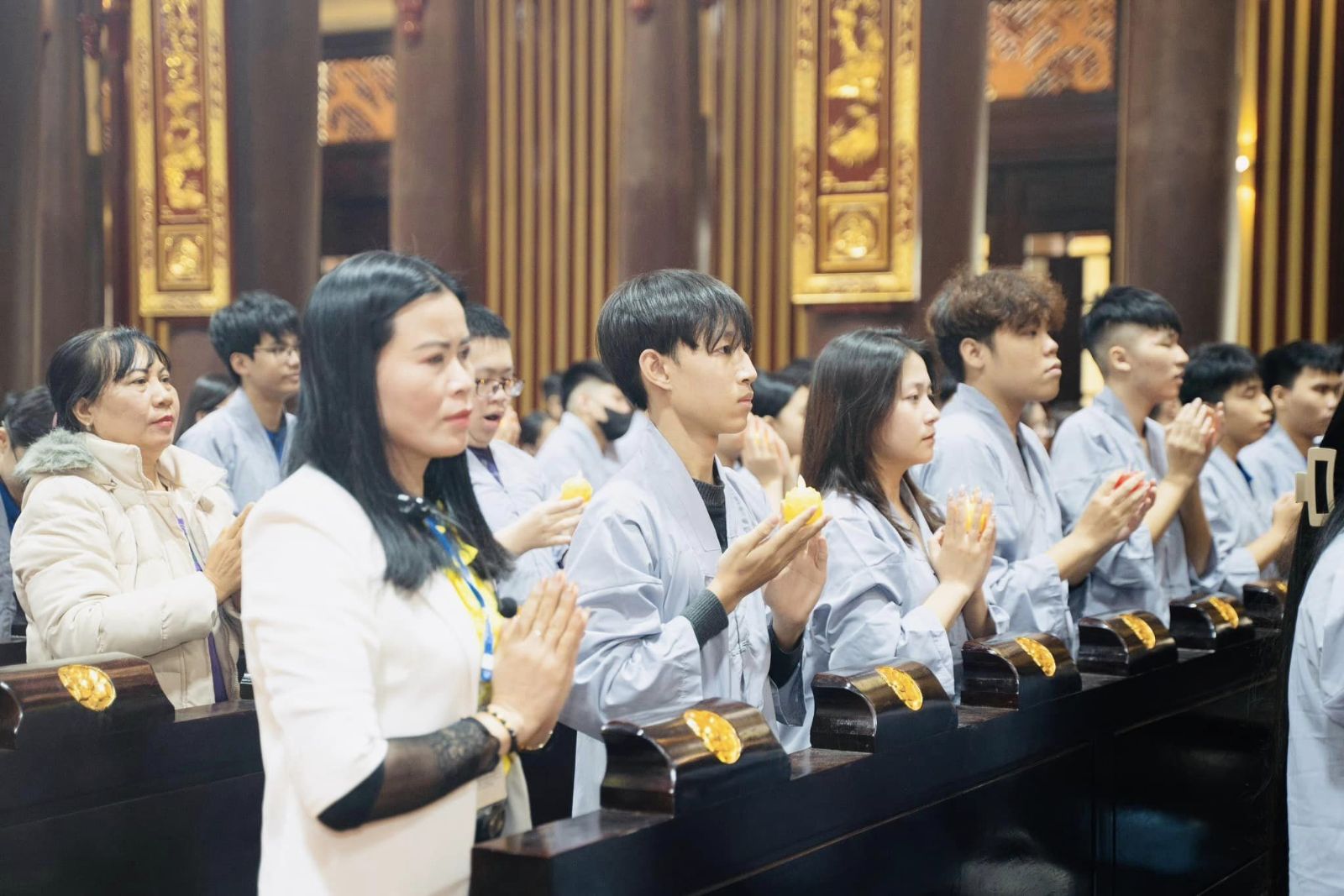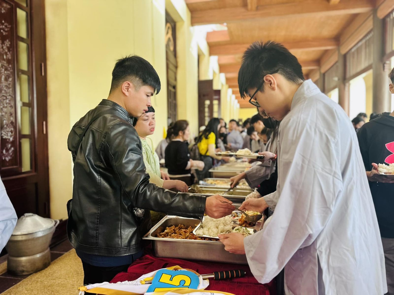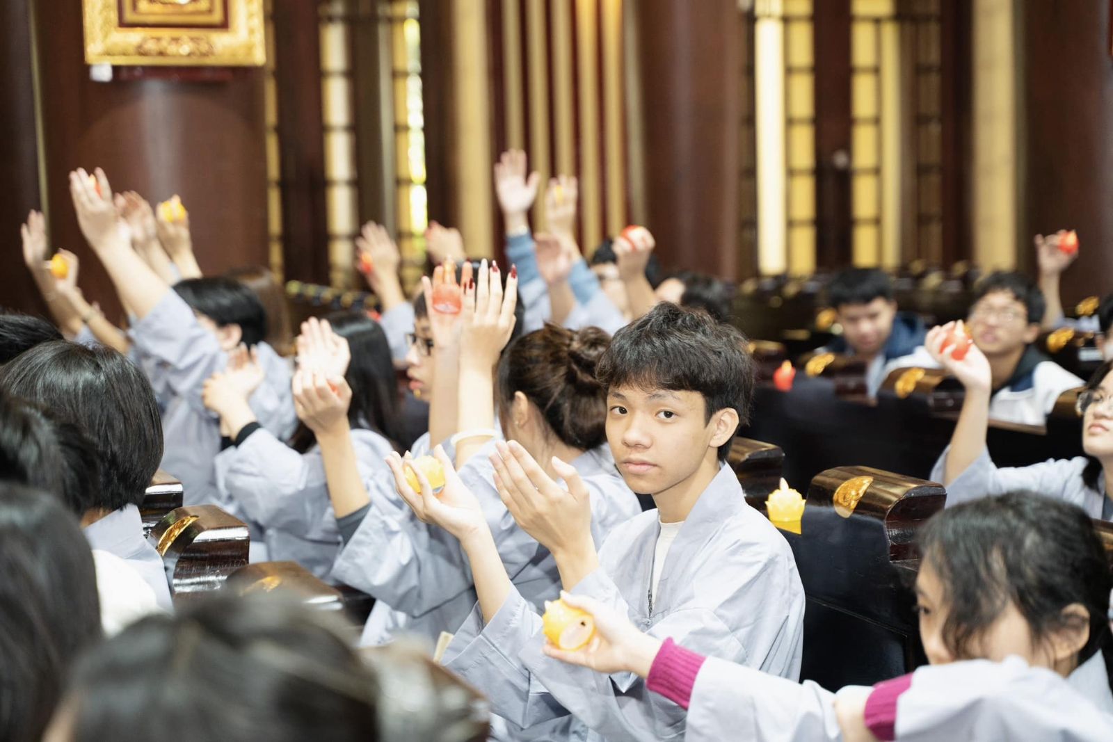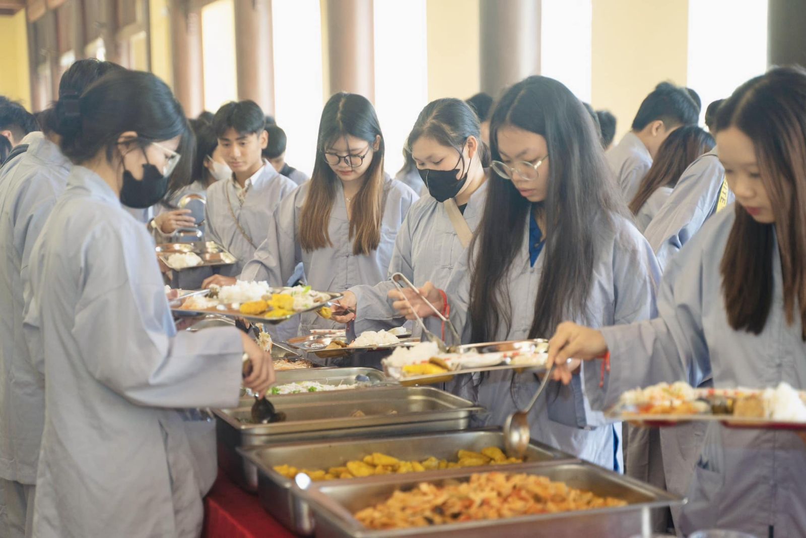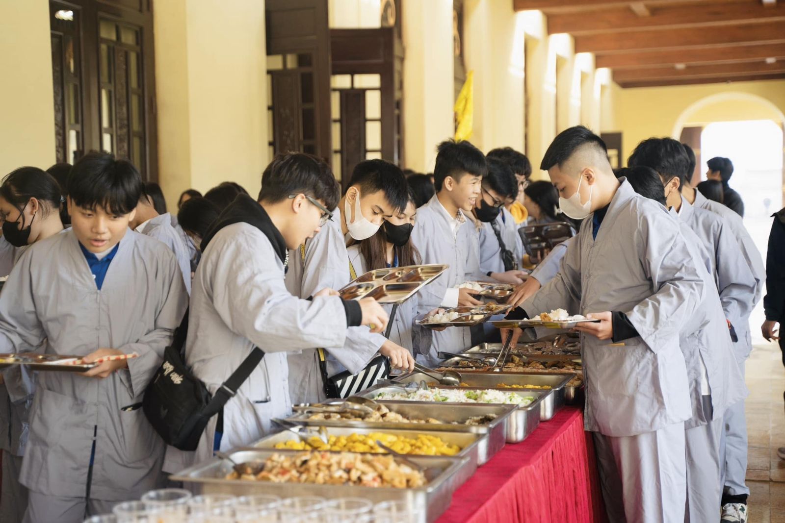 Cùng buổi, các em được trải nghiệm những hoạt động như: Đồng diễn các tiết mục văn nghệ cúng dàng lên chư Tôn Đức, dùng cơm theo nghi thức thiền môn…