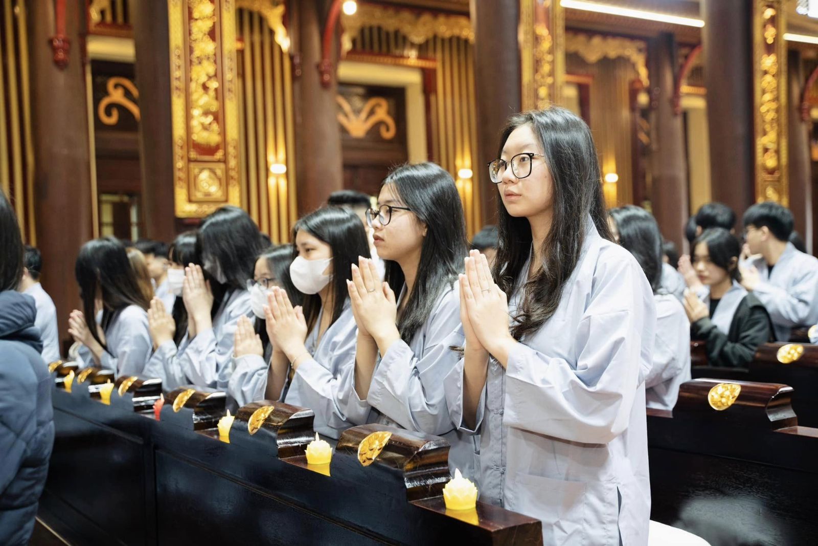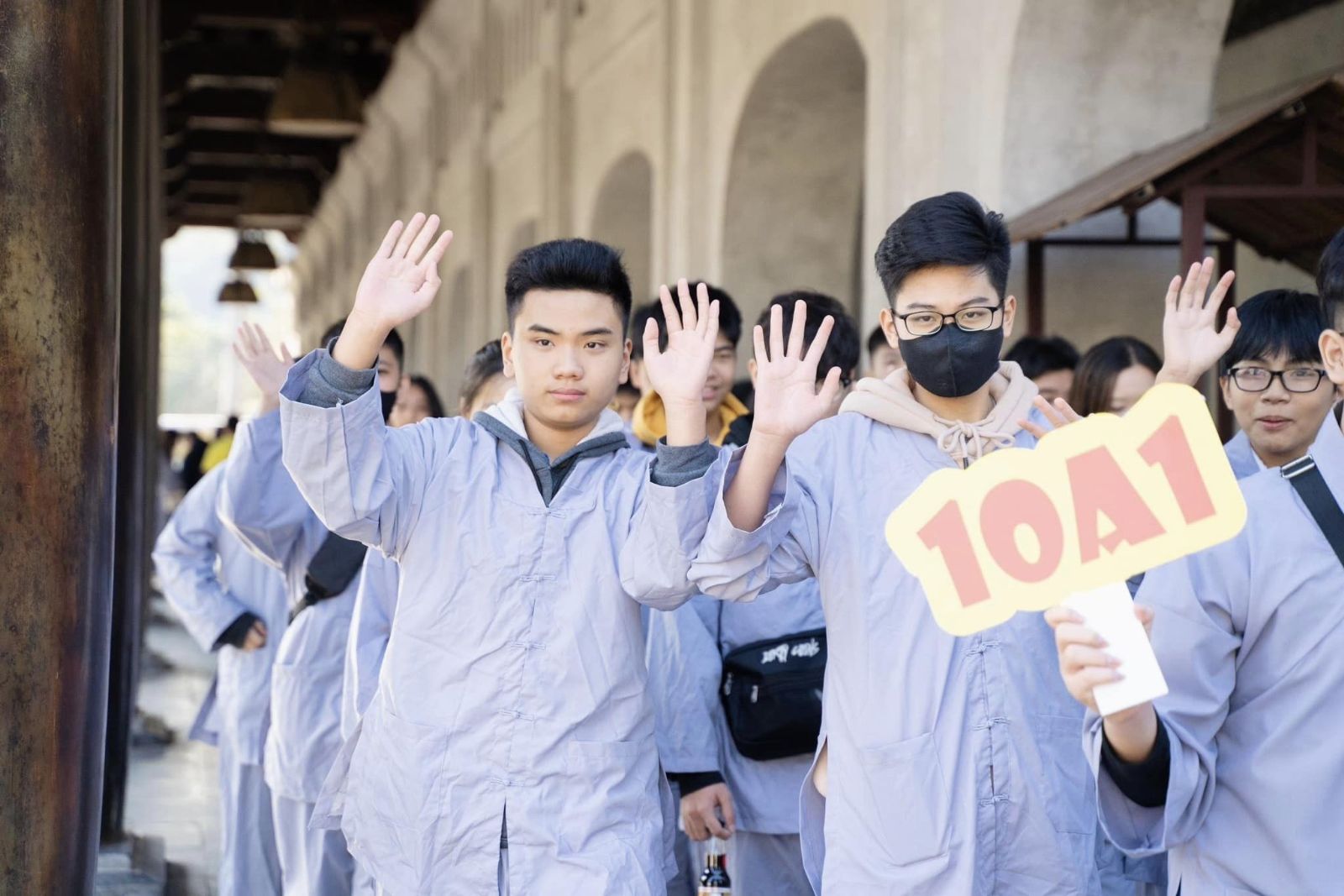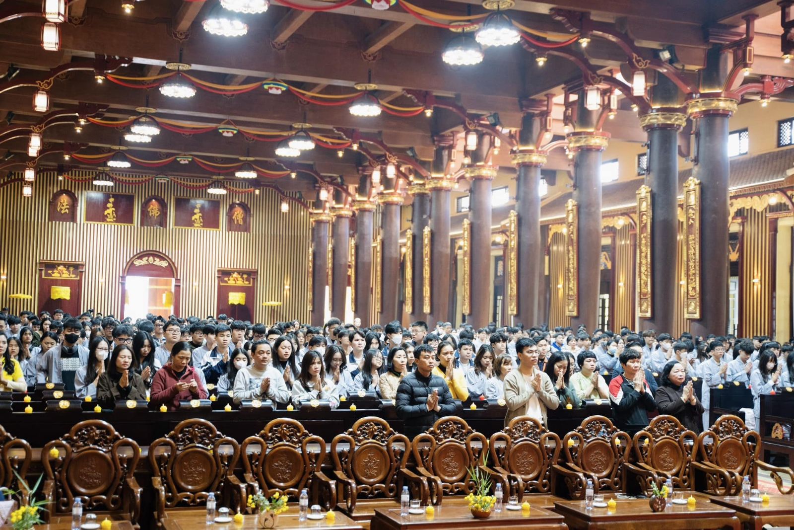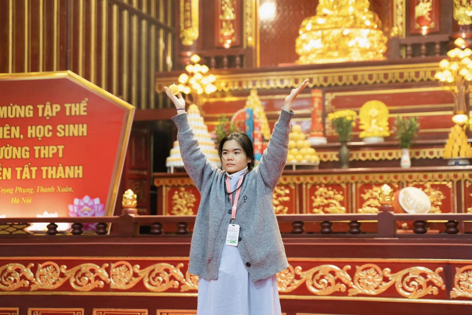 Cùng buổi, các em được trải nghiệm những hoạt động như: Đồng diễn các tiết mục văn nghệ cúng dàng lên chư Tôn Đức, dùng cơm theo nghi thức thiền môn…